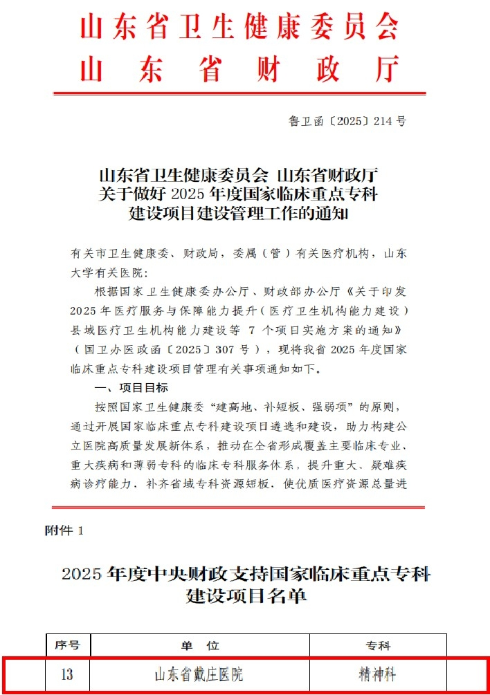近日,山东省卫生健康委、山东省财政厅公布了《关于做好2025年度国家临床重点专科建设项目建设管理工作的通知》,我校附属山东省戴庄医院精神科成功获批2025年度国家临床重点专科建设项目。